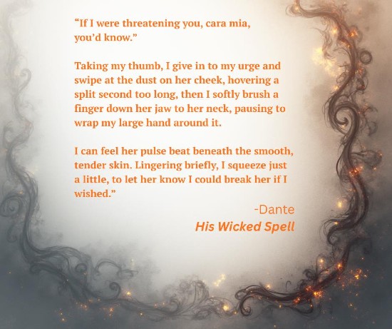 Told from dual first person perspectives (Evangeline and Dante) HIS WICKED SPELL follows Dante Vescari as he is determined to protect pharmacist Evangeline Hart. The Scarletta Crime family is disputing the Vescari territory, territory that includes the family owned Hart Pharmacy but more importantly, the Head of the Scarletta family is targeting our story line heroine, and Dante Vescari is determined to claim Evangeline as his own. Unaware and naive to the point of painful, Evangeline is caught between two powerful crime families, and her uncle refuses to cross the line and save her.