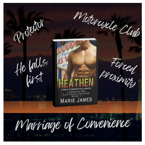 REVIEW: HEATHEN : A Very Cerberus Halloween is the first instalment in Marie James’ contemporary, an adult CERBERUS MC: LAS VEGAS MC romantic suspense series focusing on the members of the Cerberus MC- all former members of the US Marines. Cerberus MC: Las Vegas is a spin off set in the author’s Cerberus MC world. This is thirty year old, former US Marine Ellis ‘Heathen’ Burke, and twenty-six grocery store clerk year old Kaylee Rhodes’ story line.