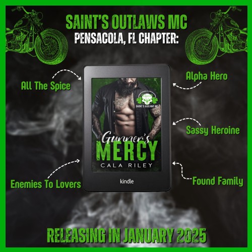 Told from dual first person perspectives (Sloane and Gunner) GUNNER’S MERCY follows the building relationship between our story line couple, and the build up to war with another MC. Sloane is desperate; her mother works three jobs, and the family is struggling to make ends meet. Hired as a mechanic at the MC owned Saints Garage, Sloane finds herself with a shadow, club VP Gunner, the man with whom Sloane will fall in love. As Sloane battles her attraction to Gunner, someone else is taking aim at our story line heroine. Meanwhile, the Crossbones MC is determined to control the territory around Pensacola, and refuse to back down with the Saint’s Outlaws MC.