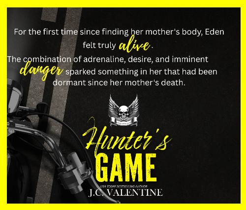 Told from dual omniscient third person perspectives (Hunter and Eden) HUNTER’S GAME follows in the wake of Hunter’s latest assignment to infiltrate the Devil’s Mark MC,working undercover to gather information on an art theft ring with connections to the Devil’s Mark MC but from the outset Hunter is pulled in to the aura that is Eden Mitchell, a young woman whose connection to both the world of art, and the Devil’s Mark MC will reveal many secrets and lies connecting our heroine to a ghost from the past. As Eden and Hunter begin to dig deeper into the missing art and artifacts, our couple will discover a family history Eden knew nothing about.