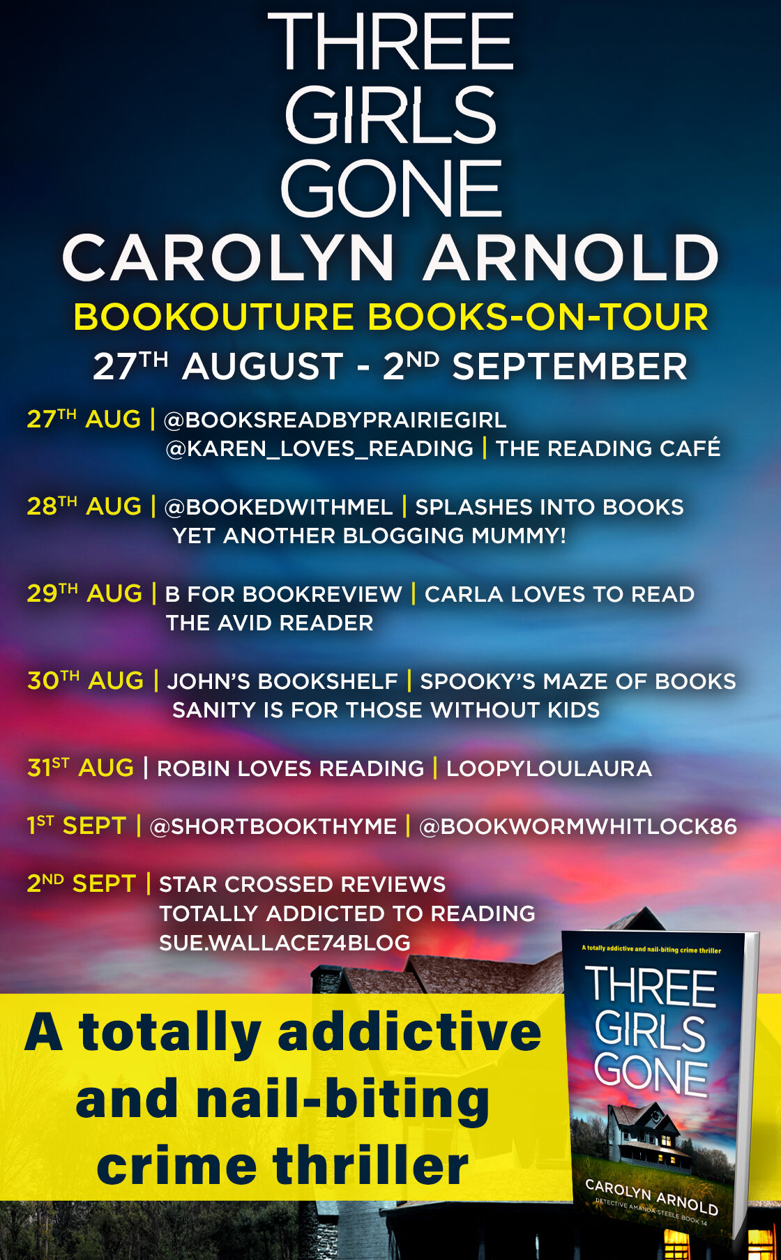 Three Girls Gone by Carolyn Arnold is the 14th book in her fabulous Detective Amanda Steele series. Refresher: As I have noted previously, I am a big fan of Arnold, having read most of her books, and I love this series, which continues with another fantastic addition. Amanda Steele, our heroine, is a homicide detective in Prince William County, Virginia.