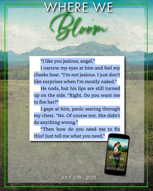 WHERE WE BLOOM is a story of secrets and danger, power and control, family and friendships, acceptance and love. The character driven premise is captivating and sensational; the romance is provocative and intense; the characters are charismatic and dynamic. Kristen Proby drops the names of a number of romance authors, to the point, it feels like advertising and promotion.