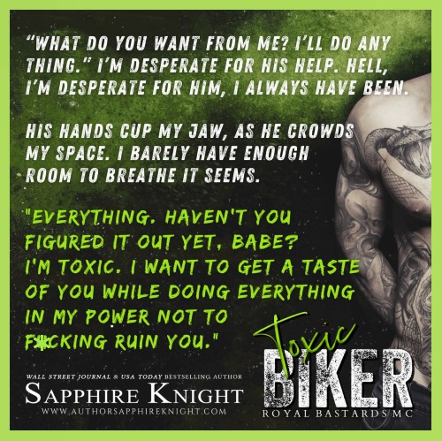 REVIEW:TOXIC BIKER is the third instalment in Sapphire Knight’s contemporary, adult RBMC: CENTRAL TX dark, erotic, MC romance series-a part of the multi-authored RBMC . This is Plague aka Asher, and Lacey Murphy’s story line. TOXIC BIKER can be read as a stand alone without any difficulty. Any important information from the previous story lines is revealed where necessary.